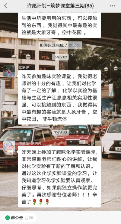 一個個實驗如魔術般輪番上陣,不斷地吸引着孩子們的眼球,引起大家陣陣驚訝聲,并紛紛提問“為什麼那個泡沫變顔色了”“時間越長,水中花園會不會一直長大”等等,紛紛探求着其中的奧妙,志願者們針對提出的問題一一做出解答。課堂結束時,小同學們意猶未盡,強烈地表達出了對化學實驗課的興趣,并且期盼下一節趣味課堂的到來。
