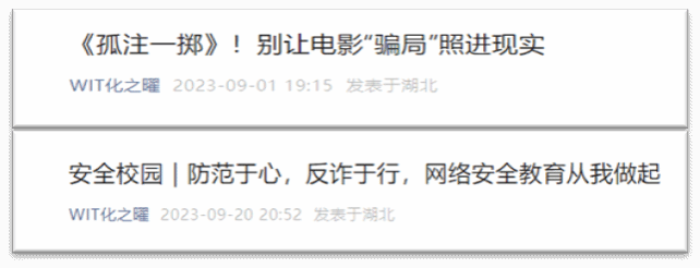 開學以來,學院認真響應湖北省教育廳、湖北省地方金融監督管理局《關于開展防範非法校園貸和電信網絡詐騙教育的提示》和77779193永利官网關心下一代委員會《關于開展“大學生國防、安全、心理健康教育” 公益大講堂活動的通知》的号召,廣泛宣傳反詐知識和積極動員學生參與創作反詐網絡文化作品,發布網絡安全、反詐教育相關推文,引導全院學生學習“星空班會——五個電話(2023版)”和“小心 ‘炸彈’ —— 校園版 ‘孤注一擲’ ”網絡小課堂,收到學習截屏540餘張,公益大講堂線上課程累計觀看7300餘次,組織召開線下主題教育班會40餘場,收取以班級為單位的學習心得40餘份,激勵學生拍攝反詐相關情景劇作品9部,其中,《防詐超重要》反詐宣傳視頻在抖音播放量達4.3萬。