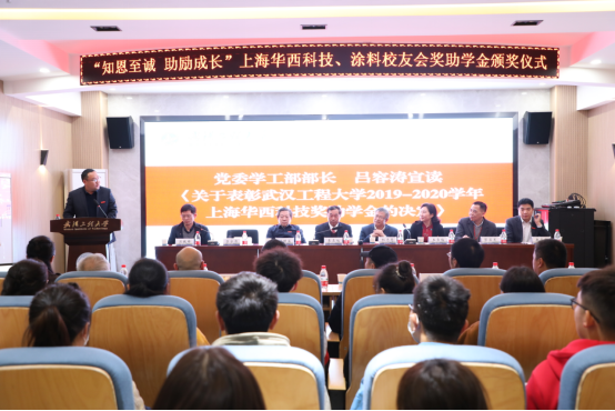 會上,校黨委副書記李志旭發表熱情洋溢的緻辭,他代表學校黨委、行政向長期關心學校發展、支持學校建設的校友們表示衷心的感謝和崇高的敬意。他指出,學校的改革發展和人才培養,離不開黨和國家的堅強領導,離不開全校師生的奮力拼搏,更離不開校友和社會各界愛心人士的鼎力支持。校友們通過設立上海華西科技、塗料校友會獎助學金,以定向捐助等方式回饋母校,本次發放金額共14餘萬元,表達出對母校的美好祝願,飽含着對學弟學妹們的厚重關懷,為母校的教育事業發展與學生資助服務工作提質保量,為推動學校“雙一流”建設作出新的貢獻。