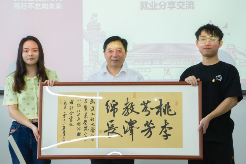 作為“回贈”,王子翔、袁麗婷則代表全班同學贈送了為程書記集體準備的禮物——一幅書法作品《桃李芬芳 教澤綿長》。