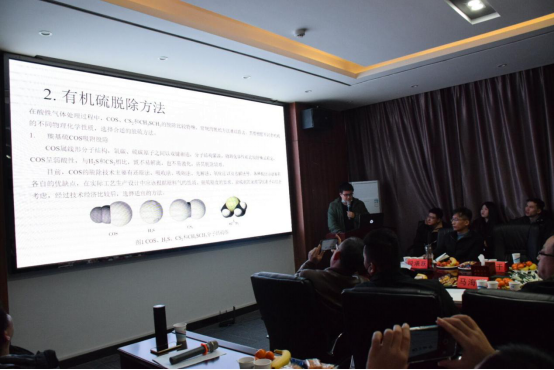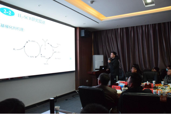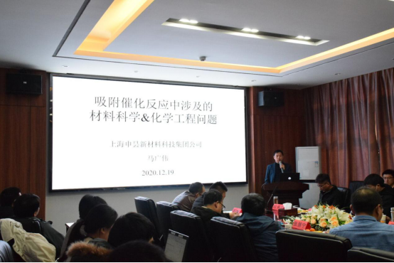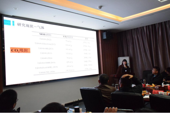 下午的學術報告由聯合實驗室的5位研究生介紹各自課題的研究進展。博士研究生孔劍作了“有機硫研究進展”的報告,碩士研究生毛惠東作了“NO催化氧化研究進展”的報告,碩士研究生羅海彬作了“NO催化還原研究進展”的報告,碩士研究生羅時萬作了“芳香烴吸附研究進展”的報告,碩士研究生王洪婷作了“基于MOFs材料的氣體吸附分離研究進展”的報告。申昙集團高層對聯合實驗室的課題進展給予了充分肯定,并從材料設計、研究方法和應用場景等方面對承擔課題的研究生給予了具體的建議和指導。