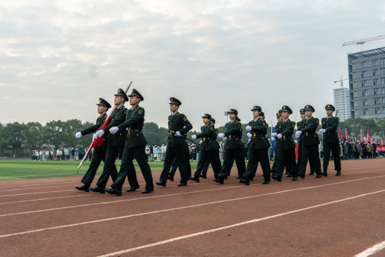 國旗護衛隊邁着铿锵有力的步伐護送國旗進場,在莊嚴的國歌中,鮮豔的五星紅旗冉冉升起、迎風飄揚。全場師生神情專注行注目禮,表達對祖國的崇高敬意。
