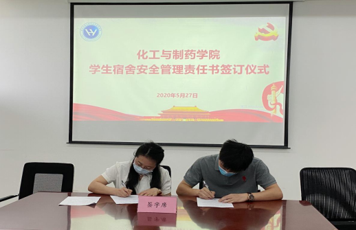 學院黨委副書記周丹與輔導員代表黃鈔華簽訂學生宿舍安全管理責任書。