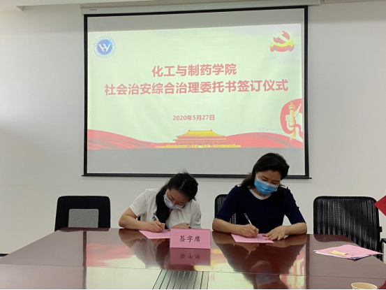 王雪梅與黨委副書記周丹簽訂二級單位社會治安綜合治理委托書。