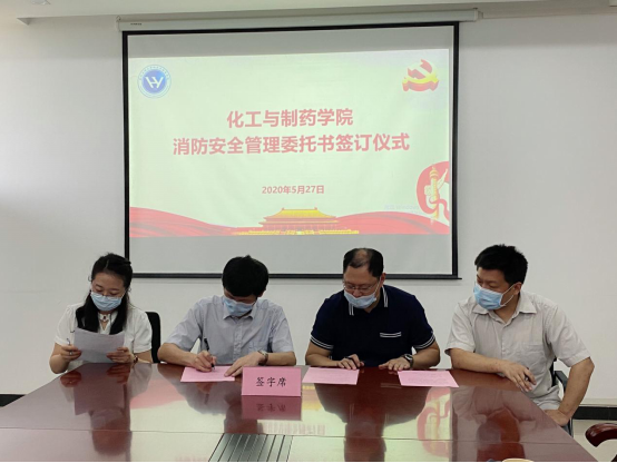 汪鐵林與黨委副書記周丹,副院長郭嘉、金放分别簽訂二級單位消防安全管理委托書。