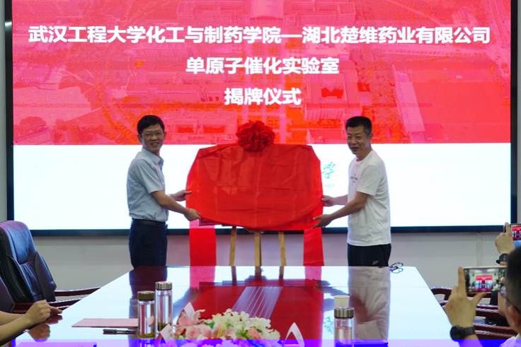 77779193永利官网黨委書記汪鐵林、湖北楚維藥業有限公司董事長熊進軍代表雙方為單原子催化實驗室揭牌。