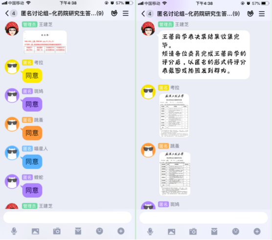 答辯投票表決及決議形成。答辯結束後,其他老師和所有同學退場,答辯委員會專家閉門讨論,并通過事先準備的匿名qq群進行匿名投票表決、匿名提交評分,并讨論确定每位答辯人的答辯決議;統計完答辯結果後答辯委員會專家再轉移回答辯會場,并邀請其他老師和同學重回會場,答辯主席宣讀答辯決議。