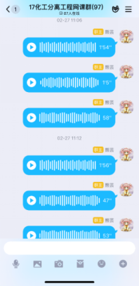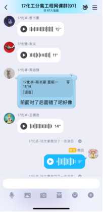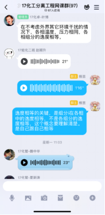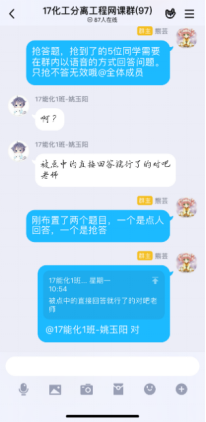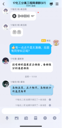 第一次在線課程快結束時,有學生反饋,雖然互動的形式很有意思,但效率不高,因為優學院app的聊天功能受限,不能發語音;每門課程的班級都有一個群聊,且群聊名稱都一樣,并不知道分離工程的課程群聊是哪個。在接納了同學們的意見後,決定網上教學不完全依賴優學院平台,發起投票,由學生決定互動環節在QQ群内進行還是在釘釘上進行,多數學生選擇了QQ平台,于是建立了QQ網課群,采用優學院+QQ群雙管齊下的模式,開展網絡教學。